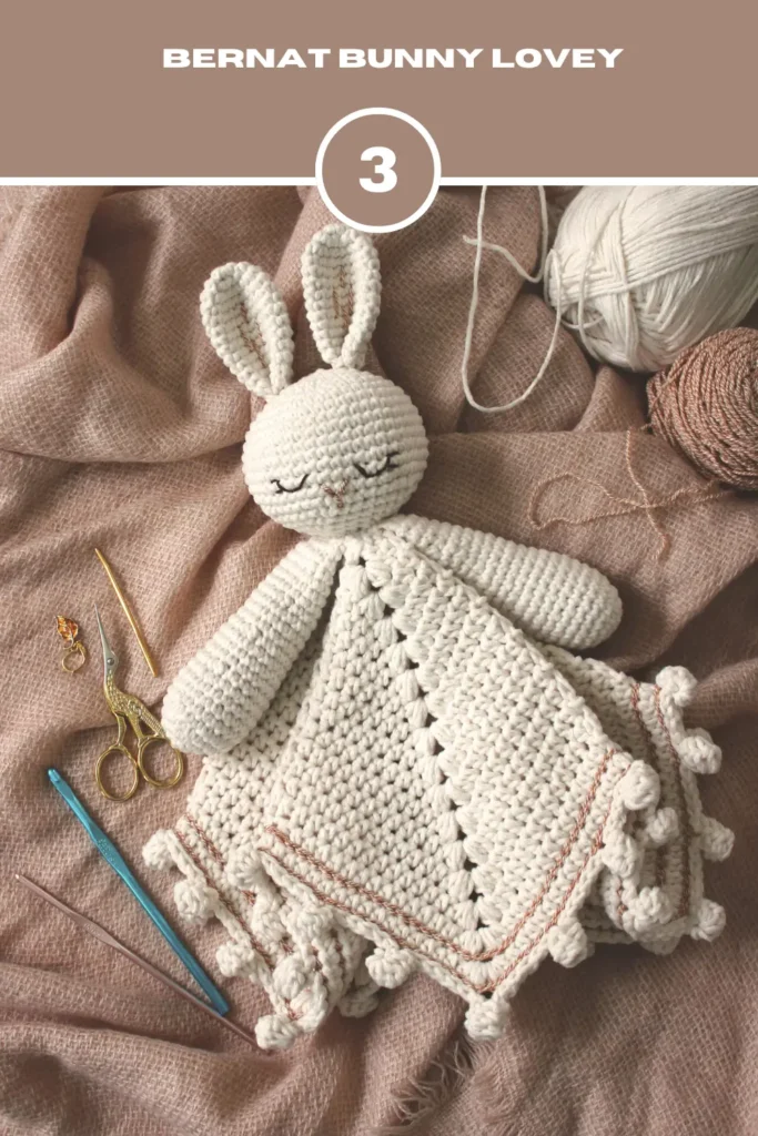 The Bernat Bunny Lovey pattern is a mix of a cozy blanket and a cute bunny head with arms. It’s a great gift for babies and toddlers. This crochet bunny pattern is easy and uses simple stitches, so beginners can make it too. The lovey is soft and comfy, giving comfort and a friend to snuggle with. When it’s done, it’s both useful and adorable, perfect for cuddling.
