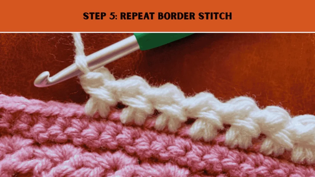 Keep doing steps 3 and 4 all the way around the edge of your crochet project. Make sure to repeat them carefully for each stitch on the border. This will give your project a nice, finished look.