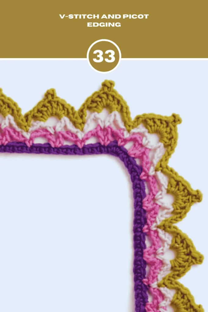 The V-Stitch and Picot Edging is a beautiful way to add a special touch to your crochet projects! This border combines fun V-stitches and cute picot stitches to create a lovely lacy scallop effect. It’s perfect for making baby blankets feel extra pretty and delicate. If you want to make your blankets stand out, this edging is a super fun choice that will make them look even more charming!