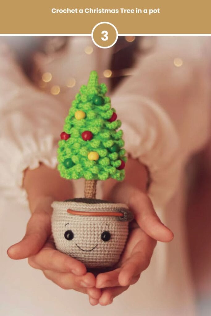 Want to crochet a Christmas ornament but find something different beyond the snowman? Then try out this little, cute Christmas tree in a pot crochet pattern. This crochet Christmas tree pot is designed by JuliiaPyha for an intermediate skill level. For crocheting this pattern, you will need 1.5 mm and Sport weight/5ply yarn YarnArt. For more customization, you can use Black sewing threads, a 7 mm safety eye, with Polyester toy filling. The finished size of this Christmas tree is approximately 15 cm (5.9 inches) tall.