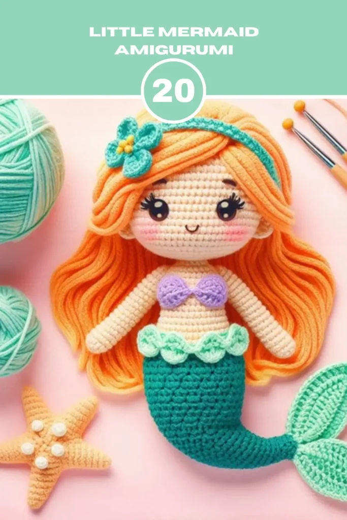 Crochet the Coral the Mermaid with a lovely pattern. Here you will get clear instructions to make Coral which has a tail and sea-themed accessories. It’s great for those with some crochet experience. They will easily make it using basic stitches like single and double crochet. Plus you can customize colors and add your own touches.