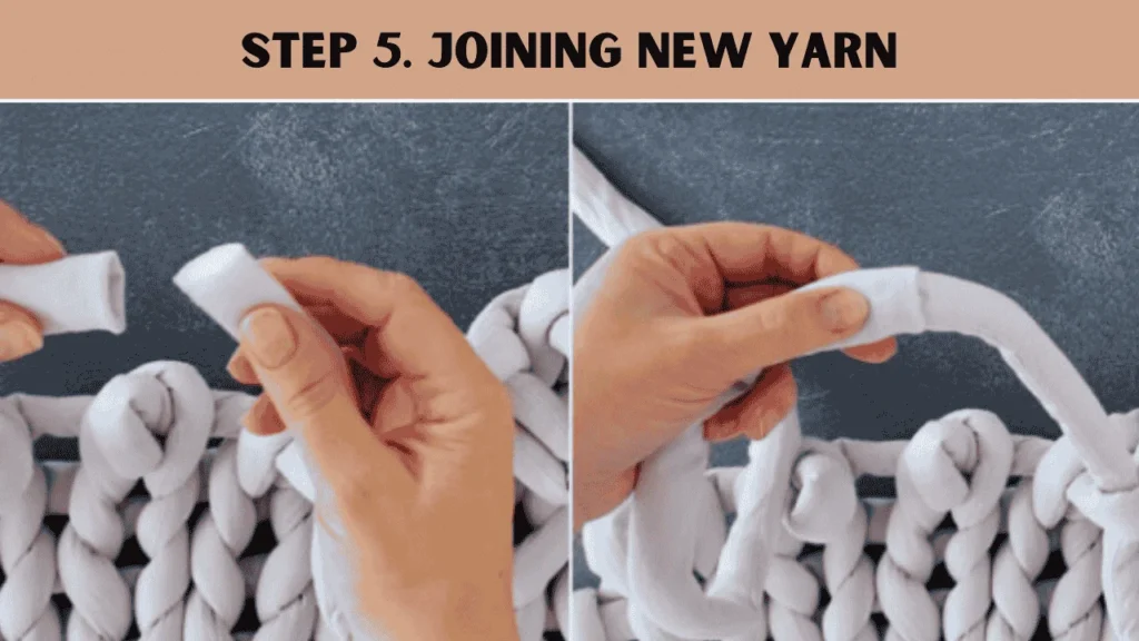 1. For chunky chenille yarn: Tie the old yarn and the new yarn together in a double knot. Pull it tight and cut off the extra yarn.