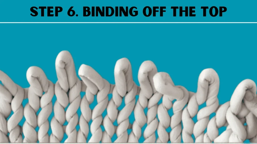 When the blanket is the right size, make the last row loops a bit bigger. Cut the yarn, leaving a 12-inch tail, then go to the other side and start binding off.