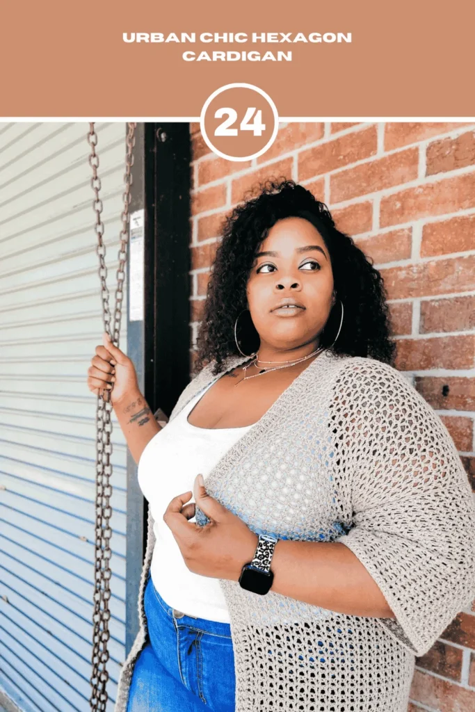 This cool cardigan has hexagon shapes in a modern design. It’s perfect if you know some crochet basics. You’ll connect the hexagons neatly and can add a fancy edge if you like. Wear it to work or on a night out for a stylish city look.