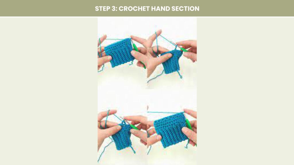 Now, crochet up to the bottom of the fingers instead of the full hand length. Use half double crochet or single crochet stitches for this part.