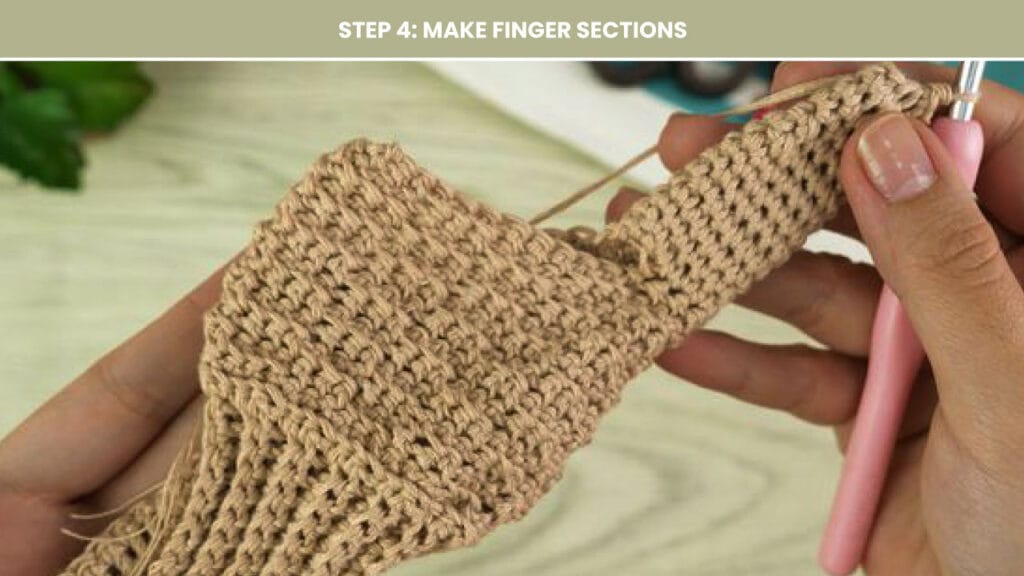 Next, divide the top part into five equal parts. Use stitch markers to show where each finger starts. Then, start with one finger. Join the yarn. To form small rounds, crochet with single or double crochet. Continue that to the end of the finger. After each finger, fasten off the yarn. Do this for all fingers.