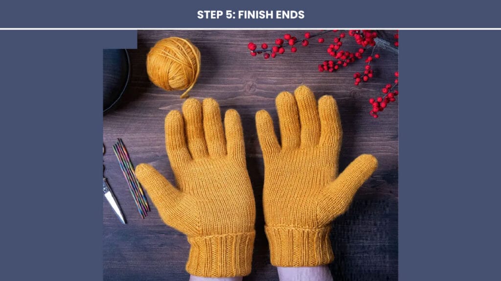 And, finally, you are expected to hide the loose yarn using a yarn needle. Place the ends in the inside stitches. Then, trim any extra yarn. Now your gloves are finished!