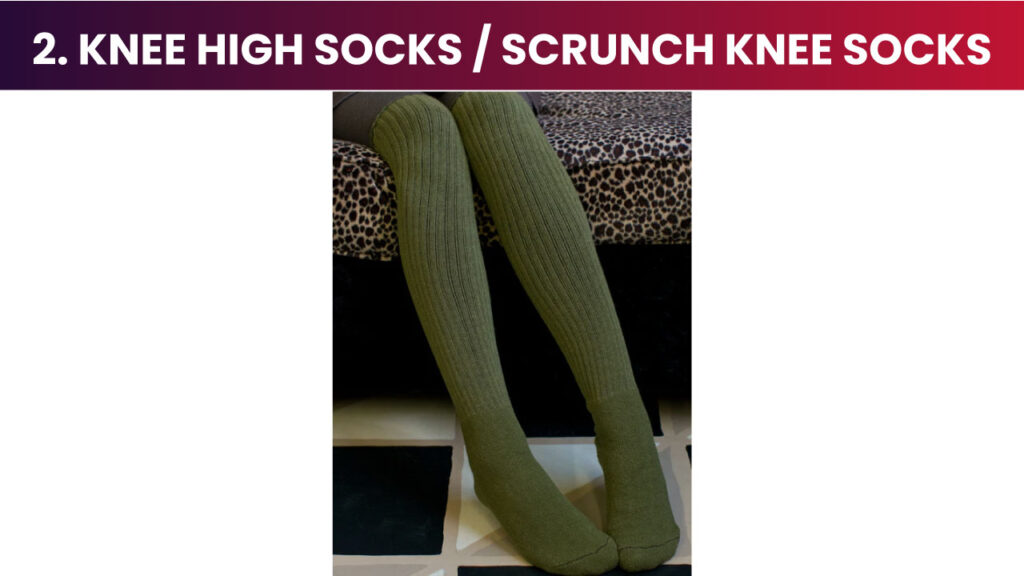 Thigh-high scrunch socks are above your knees. They’re stylish and warm. Many women pair them with miniskirts or long shirts. They come in bright colours, too, such as red, yellow, or turquoise, for a fun, sassy look.